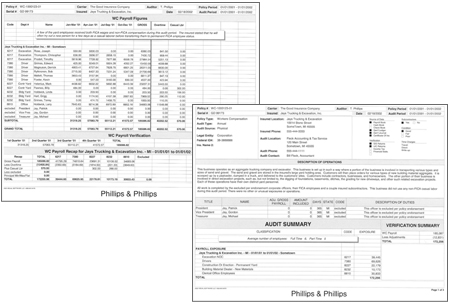 Premium AuditPhillips & Phillips provides fully automated physical, voluntary, telephone and preliminary audit services. Our veteran staff of auditors is qualified and trained to perform Workers Compensation, Commercial General Liability, Automotive-Fleet, Special Group, Dental and Health Plan audits. No matter the audit type, we make sure that each audit meets the client's requirements. Physical Audits - Experienced field auditors, trained and kept up to date on all current aspects of premium auditing, visit the location of records address for a comprehensive on-site interview and review of business records. These skilled representatives provide not only the basic and necessary audit exposure information, but also furnish a detailed description of operations and any additional valuable information provided by the insured during the audit process. Voluntary and Telephone Audits - Our staff of experienced auditors performs both voluntary and telephone audits. These nationwide services receive the same exacting diligence and attention that all of our physical audits command. With using veteran auditors and staff on these assignments, you can rest assured that all potential premiums have been explored and developed. These assignments can be designed and completed per our customers’ special requirements or by using our established formats. |